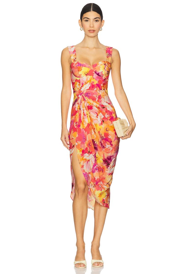Bold floral prints in bright pink, orange, and yellow hues adorn a fitted sheath silhouette crafted from soft crepe fabric. Featuring a flattering sweetheart neckline and wide straps, this midi dress is enhanced with front ruching and an asymmetric hem for a modern twist. The invisible back zipper and padded underwire cups ensure a sleek, supportive fit. Ideal for warm spring and summer evenings, this elegant, romantic piece is perfect for cocktail parties, date nights, or a stylish night out on the town.