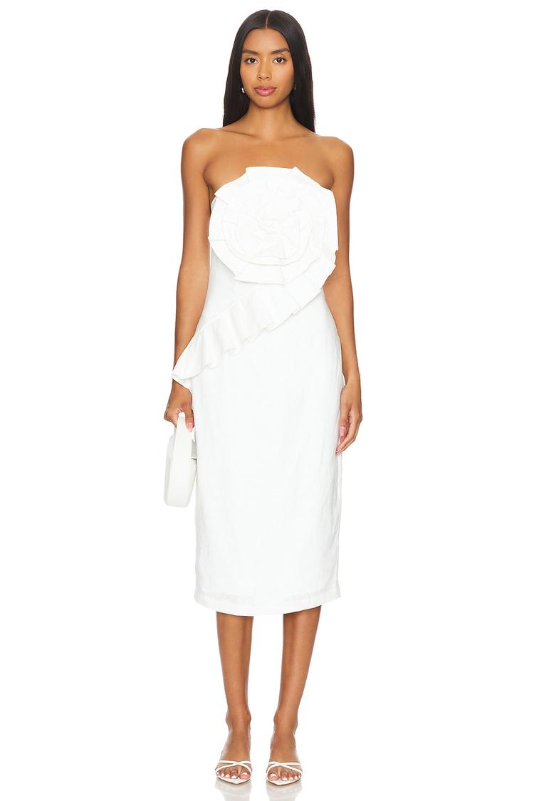 Clean lines and a sleek straight neckline define this elegant sheath dress crafted from breathable linen. The midi length and fitted silhouette offer a sophisticated profile, enhanced by a stunning florette applique accent at the front. A hidden back zipper and subtle back vent ensure comfort and ease, making it perfect for cocktail parties, date nights, or formal spring and summer events. The strapless, sleeveless design adds a timeless chic touch to this classic piece, ideal for elevating any special occasion look.