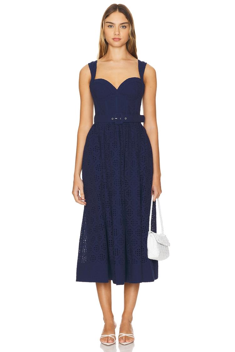 navy eyelet midi dress