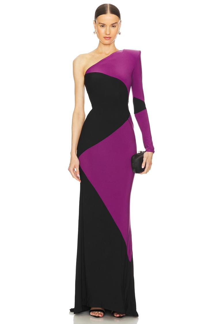 Striking in a sleek column silhouette, this gown features a bold color-blocked design in matte black and purple. The asymmetric neckline and one long sleeve add modern elegance, while the fitted jersey fabric ensures comfort and ease of movement. An exposed back zipper and shoulder padding provide a flattering fit and subtle structure. Ideal for cocktail parties, formal galas, and red carpet evenings, this maxi gown blends sophisticated style with contemporary flair for unforgettable occasions.
