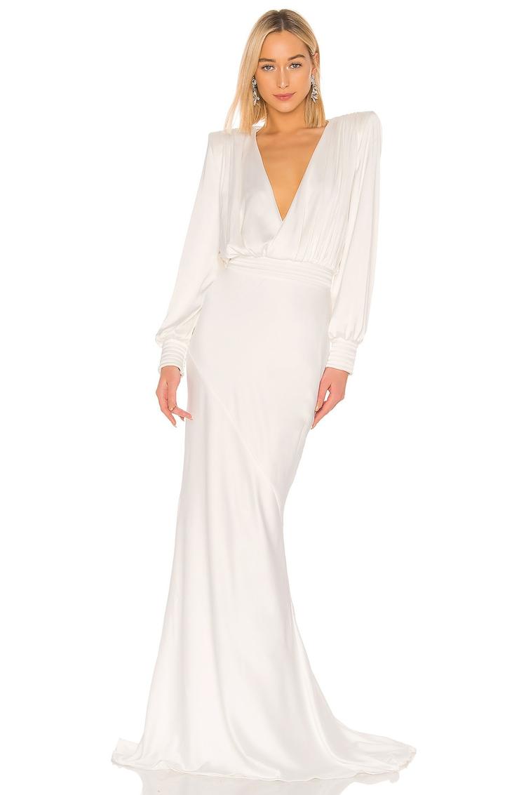 Soft matte white satin defines this column gown with a fitted silhouette that gracefully skims the body to a clean maxi hem. Long regular sleeves complement the deep plunge neckline and dramatic plunge back, creating a sophisticated and elegant look. Perfectly suited for formal occasions, gala events, and cocktail parties, this gown offers timeless style with a modern edge. The smooth satin fabric adds luxurious sheen and fluidity, making it an exquisite choice for special nights and red carpet moments.