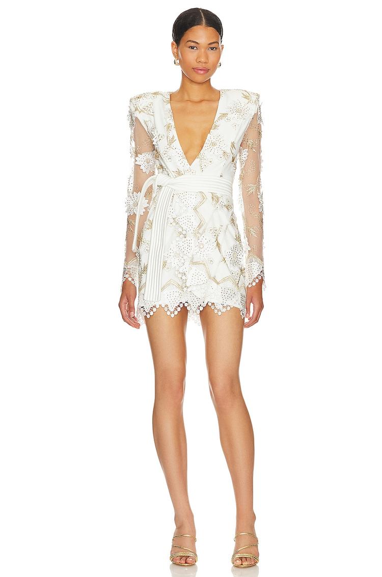 Delicate floral appliques and sparkling crystals embellish this white mini wrap dress, crafted from a midweight nylon mesh fabric. Featuring a plunging neckline and padded shoulders, the fitted silhouette highlights a waist tie and scalloped hem for a refined finish. Long sleeves and full lining add elegance and comfort to the modern design. Ideal for cocktail parties, date nights, or an upscale night out, this sophisticated dress embodies contemporary glamour with a subtle romantic touch.