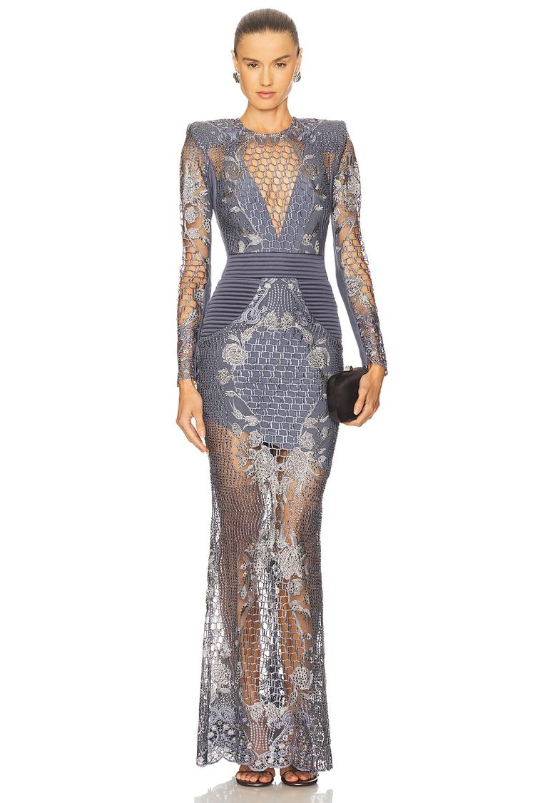 Shimmering rhinestone embellishments and padded shoulders elevate this fitted column gown crafted from sheer matte dark blue fabric with partial lining. The long sleeves and V-neckline create a sleek, elegant silhouette, while the exposed back zipper adds a modern touch. Floor-sweeping length and subtle shimmer details make it perfect for gala evenings, cocktail parties, and formal events where sophisticated style is a must.