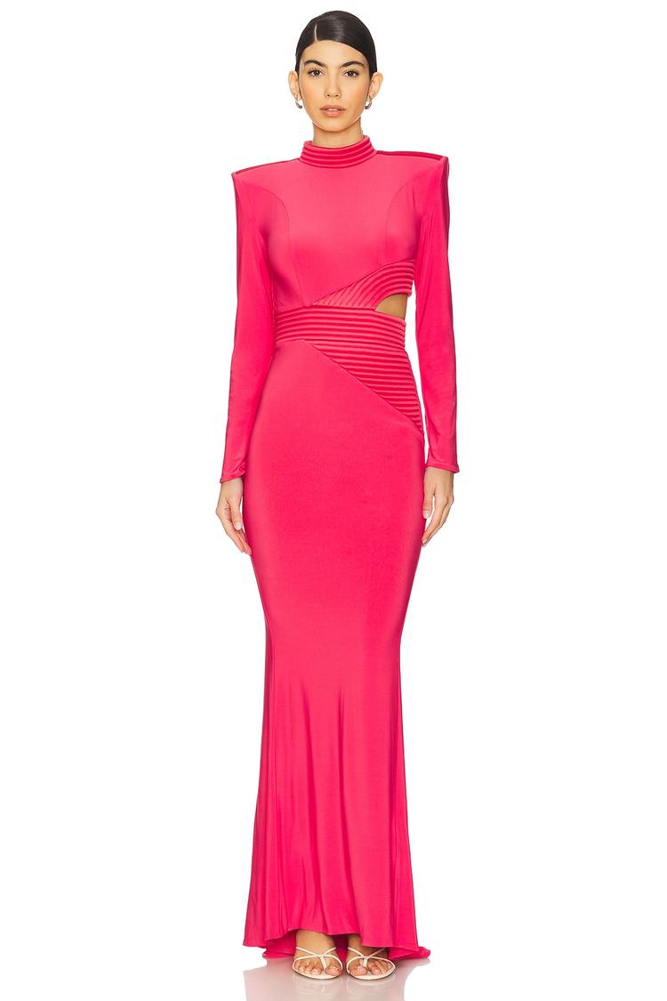Bright pink heavyweight jersey sculpts a fitted column silhouette with a high neckline and long sleeves enhanced by structured padded shoulders. The gown features a striking side cut-out that adds modern edge to its elegant, maxi length profile. Finished with a clean hemline and a back zip closure, this dress balances sophistication with bold design details. Ideal for cocktail parties, formal events, or a memorable date night, it offers both style and comfort with its stretch polyester-spandex blend, making it a versatile standout in any wardrobe.