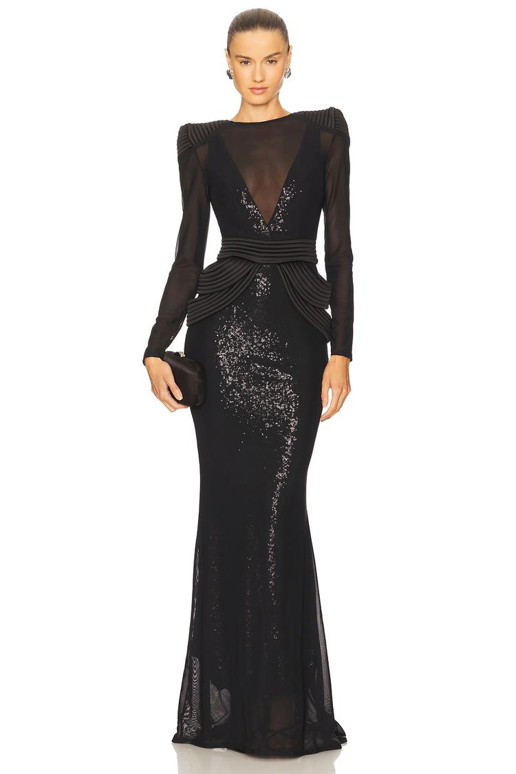 Shimmering black sequins paired with a sheer mesh overlay create a sleek column silhouette that elongates the figure in this maxi gown. The fitted design features a deep V-neck and long sleeves with structured padded shoulders for a bold yet elegant statement. An exposed back zipper and open back detail add modern sophistication, while the clean hemline maintains timeless grace. Ideal for formal occasions, galas, and black-tie events, this gown blends artistry with refined glamour for unforgettable evening wear.