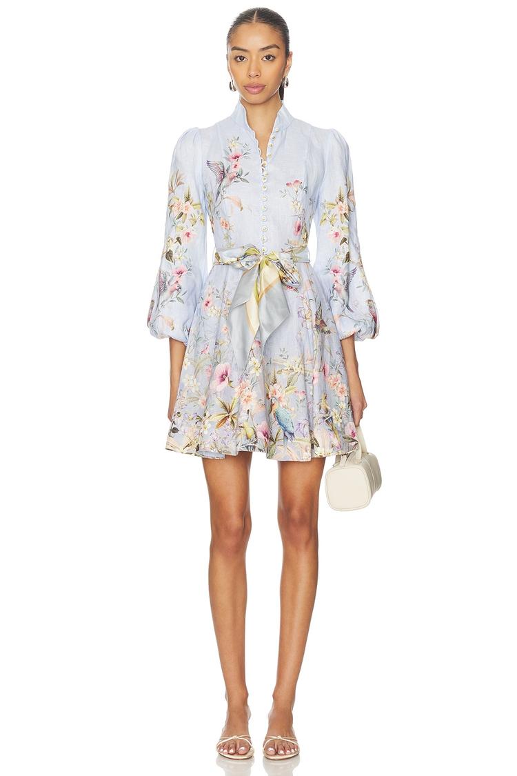 Soft linen with silk accents blends comfort and elegance in this floral shirt dress. The mini length and regular fit create a flattering silhouette, complemented by a V-neckline and three-quarter sleeves with ruffled hems. A detachable silk belt cinches the waist while hidden back zip and front buttons offer refined closure details. Perfect for spring and summer brunches, date nights, or chic cocktail events, this dress features side seam pockets for added practicality. The all-over pastel floral print on a matte light blue base exudes timeless, modern sophistication.