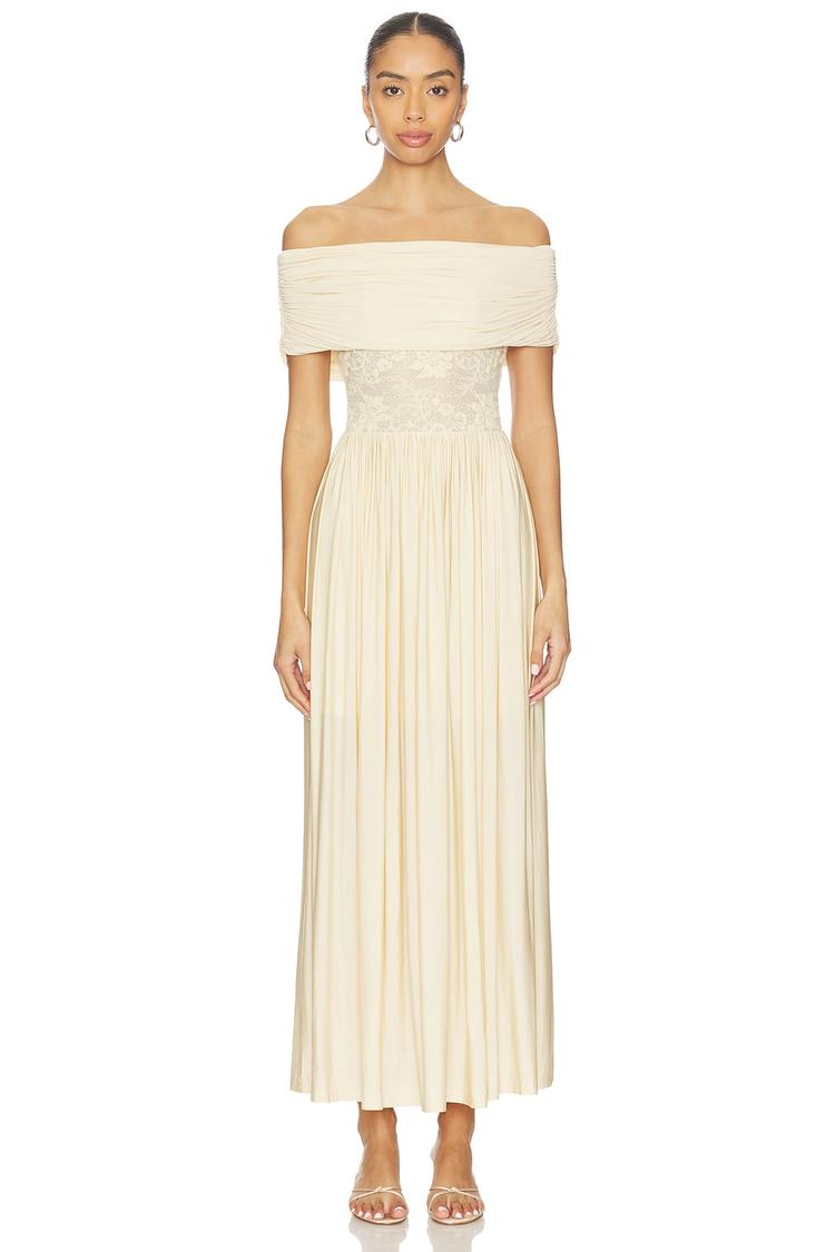 A luxurious cream shift dress crafted from heavyweight jersey fabric features an elegant off-shoulder neckline and sleeveless styling, perfect for warmer seasons. The fitted bodice is enhanced with delicate lace trim, flowing into a pleated midi-length skirt with a clean hemline for refined movement. Concealed back zipper closure ensures a smooth silhouette. Ideal for cocktail events, date nights, or stylish brunches, this dress blends classic sophistication with modern comfort.