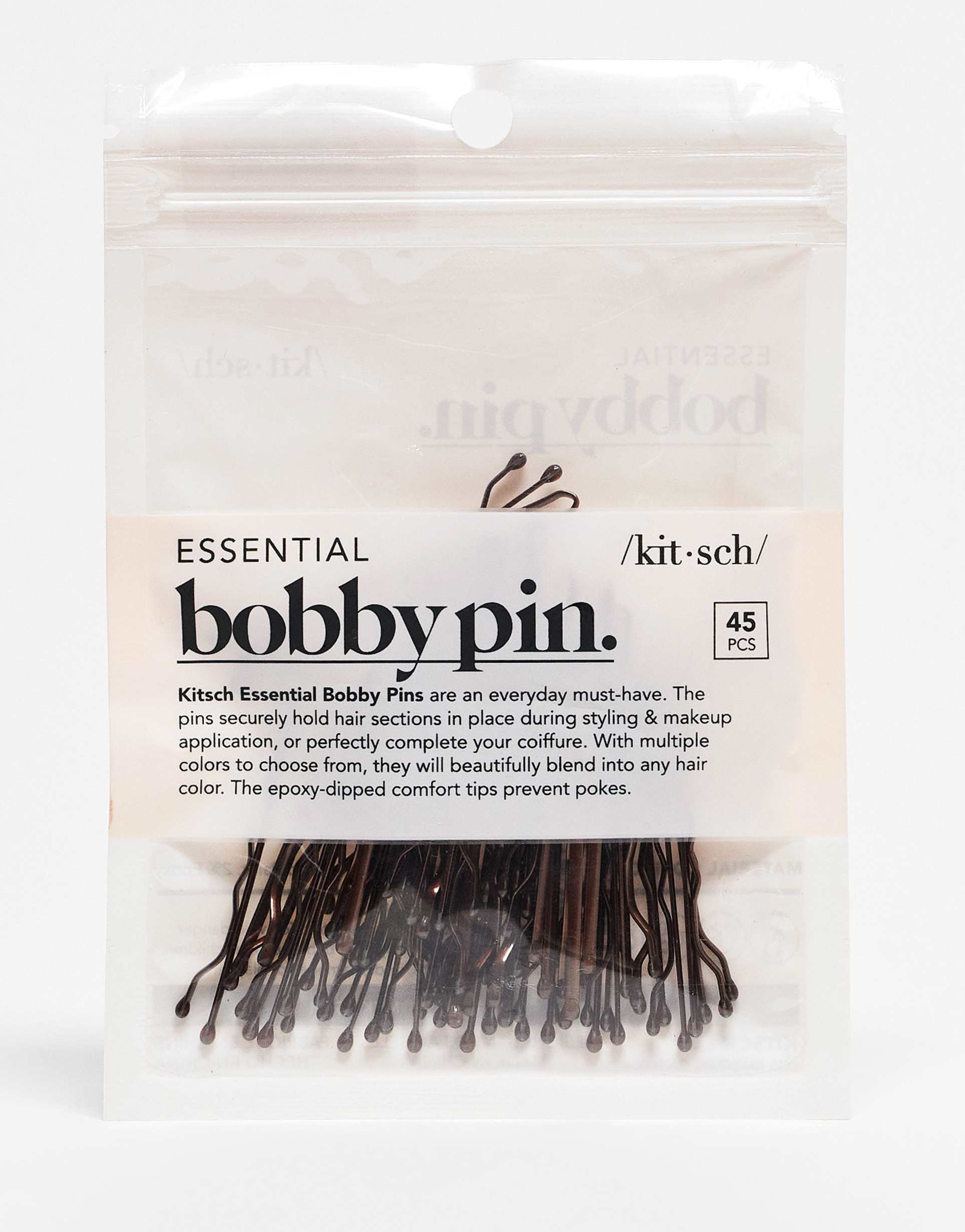 Elevate your everyday hair routine with the Kitsch Essential Bobby Pins in Brown. This 45-pack of slim, metal pins features coated tips for added grip and comfort, helping secure even tricky flyaways without snagging. The rich brown hue blends invisibly into brunette tones, delivering a clean, polished finish. Lightweight and durable, these pins are ideal for quick updos, buns, or simply tucking strands in place between washes. A versatile, go-to accessory for home, travel, or on-the-go touch-ups—functional, affordable, and designed to keep your hairstyle looking flawless all day.