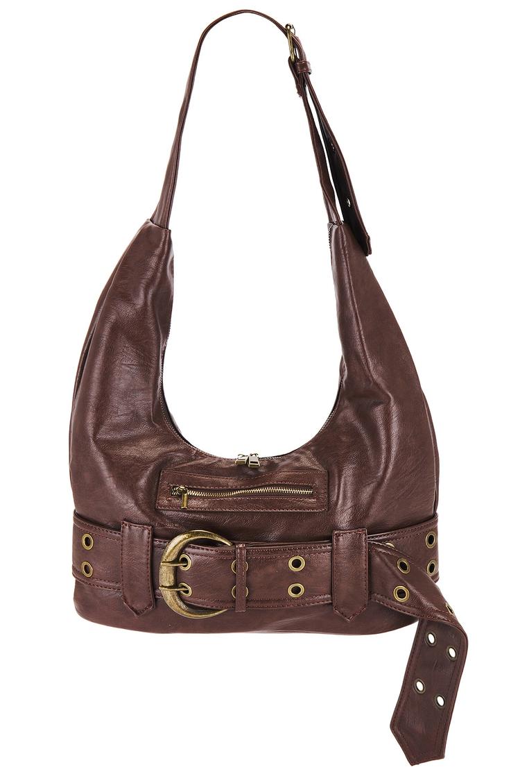 Meet the Brooke Studded Shoulder Bag by 8 Other Reasons. Crafted in rich brown faux leather, this compact, softly curved silhouette blends timeless polish with a subtle edge. Dual top zipper closure and a front zippered pocket keep essentials secure and within reach, while gold-tone hardware and buckle detailing at the base add a touch of luxe. The integrated adjustable shoulder strap delivers comfort and versatility, making it ideal for city errands, commutes, or weekend outings. With one roomy main compartment, it stays organized from dawn to dusk—effortless style that travels with you.