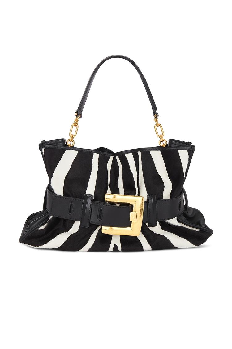 Meet the Anthem Medium Shoulder Bag, a statement piece that blends high fashion with everyday practicality. The zebra-striped dyed calf hair exterior is tempered by leather trim and a suede-lined interior for luxe texture. A belted gold-tone buckle seals the look, while an integrated leather shoulder strap with a gold-tone chain adds drama and versatility. Inside, one main compartment houses a slip pocket and a leather card slot for essentials. With its dual magnetic closures and Italian craftsmanship, this Balmain bag takes you from day to night with fearless sophistication.
