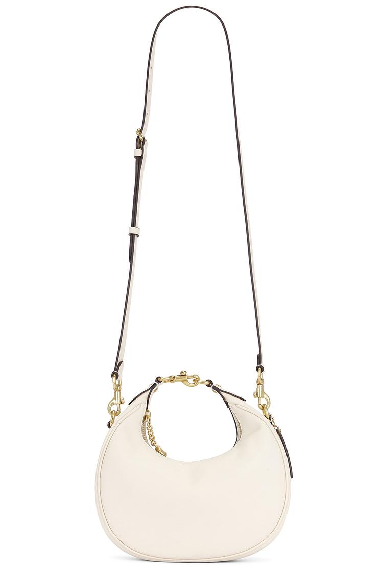 Meet your new go-to crossbody for effortless elegance: the Jonie Bag 22 in creamy leather. Crafted with a supple leather exterior and a suede lining, it gleams with brass-tone hardware and a polished gold chain accent. The compact crescent silhouette houses one main compartment with a single interior pouch pocket, secured by a top zip. Wear it two ways: detach the adjustable crossbody strap for hands-free convenience, or lift the top handle for a chic, elevated look. Perfect for day to night, from casual brunch to a refined evening out.