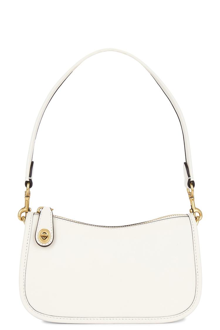 Meet the Coach Swinger 20 Bag—a elegant compact silhouette in glove-tanned leather, rendered in pristine white. The top zip secures a single roomy compartment, while three interior card slots keep essentials neatly organized. Gold-tone hardware adds a touch of luxury, including a detachable leather shoulder strap for daytime versatility. A discreet logo detail accents the curved frame, finished with clean stitching and a chic, minimalist profile. Sized at approximately 20 cm wide by 11 cm high by 6 cm deep, with a 19 cm shoulder drop, this sophisticated piece transitions effortlessly from work to weekend—where style meets practical everyday function.