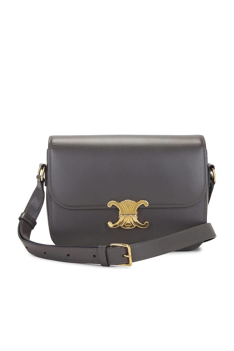 Meet your new go-to companion for effortless, elevated style: a sleek, deep charcoal calf-leather shoulder bag from FWRD Renew presenting the iconic gold-tone Triomphe logo. The minimalist flap opens to three compartments, including a zip pocket and a flat pocket, keeping essentials perfectly organized. A detachable, adjustable crossbody strap lets you switch from shoulder to crossbody with ease, while the press-lock closure keeps items secure. Made in Italy with supple leather and gold hardware, this timeless piece wears from desk to dinner. Lightly worn, it feels refined and ready for everyday luxury.