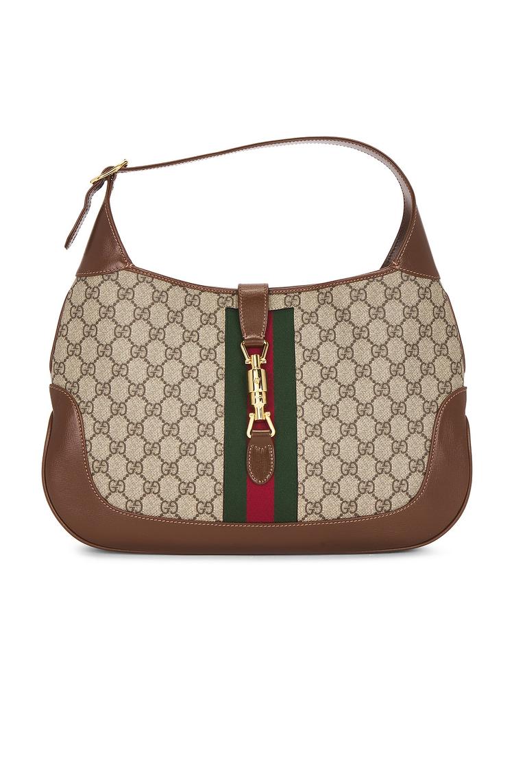 Meet the Jackie 1961 Hobo – a timeless blend of canvas, calfskin leather trim, and suede lining. The classic beige GG canvas is grounded by chocolate brown leather corners and piping, while a bold Gucci web stripe in green and red runs center-front, punctuated by a gold-tone piston-lock closure. This hobo silhouette offers a single main compartment with interior zipper and slip pockets, a comfortable shoulder strap with a 15 cm drop, and a refined finish that transitions from day to evening. Crafted in Italy, it exudes heritage, function, and luxe ease for everyday glamour.