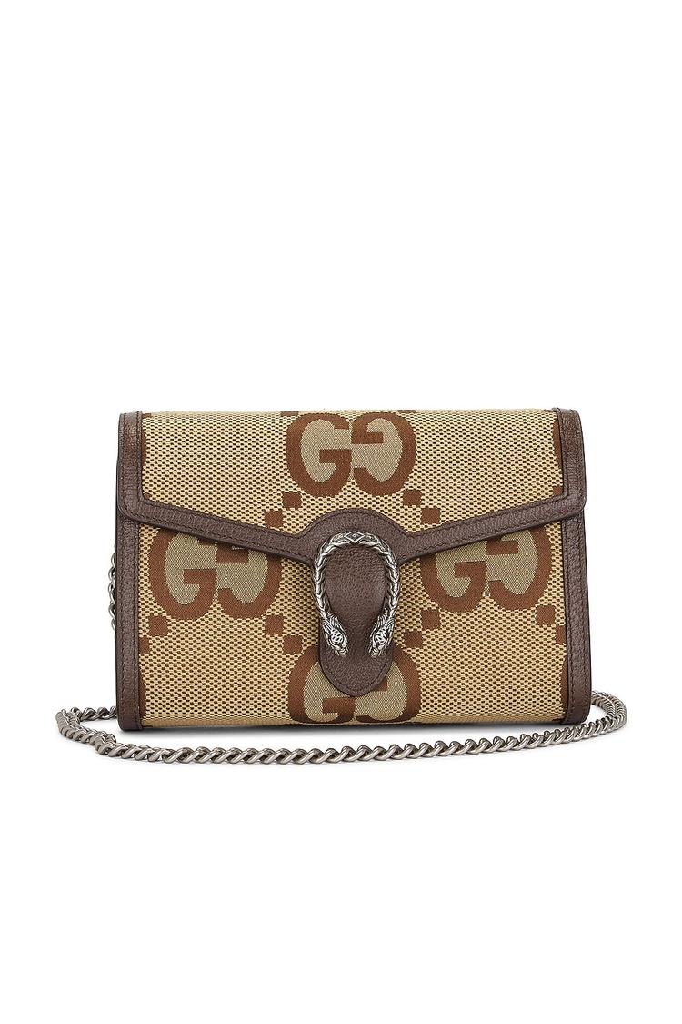 Meet the Gucci Jumbo GG Mini Dionysus Shoulder Bag—an iconic blend of heritage whimsy and refined craft. Crafted in beige GG canvas with rich brown leather trim, this compact shoulder bag features the signature tiger-head clasp in silver-tone hardware, a front flap closure, and a slender chain strap that drapes beautifully over the body. Inside, three compartments, 16 interior card slots, dual bill slots, and a center zip compartment keep essentials impeccably organized. Made in Italy, this luxe micro bag elevates day-to-night looks with timeless elegance and subtle, instantly recognizable branding.