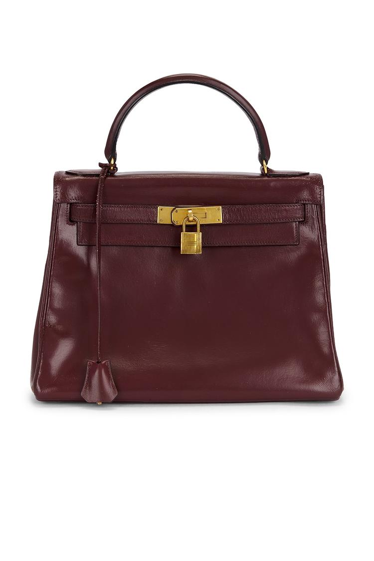 Meet a timeless icon: the Hermès Box Kelly 28 in rich burgundy calfskin, finished with gold-tone hardware. This structured top-handle satchel closes with a signature turn-lock, while a classic clochette hinting at its secure provenance accompanies the piece. Inside, one main compartment shelters a zip pocket and two slip pockets for effortless organization. A delicate leather tassel adds quiet sophistication, lending an elevated, vintage feel. Perfect for formal events or refined day-to-night looks, this compact silhouette delivers lasting luxury and unmistakable presence.