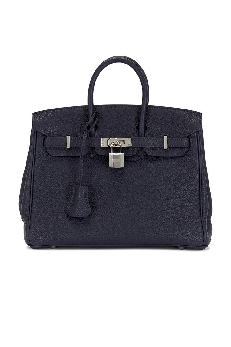 Meet a timeless statement piece crafted in navy calfskin with argent hardware. This Hermes-inspired Birkin 25 captures iconic elegance with its structured silhouette, durable top handles, and a discreet turn-lock closure that hints at refined luxury. The bag opens to a single, spacious main compartment complemented by an interior zip pocket and a flat pocket, all lined in smooth leather. Complete with a classic clochette and lock, it’s made in France and designed for day, night, and everything in between. A versatile, impeccably crafted companion for elevated everyday style.