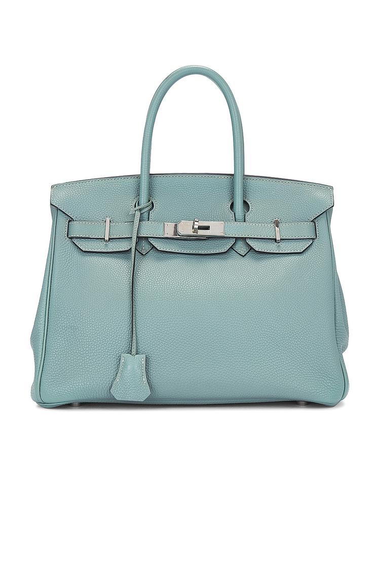 Meet your new go-to statement piece: a Birkin‑style handbag in serene teal Togo leather. This structured satchel features a foldover top with a discreet turn‑lock closure, two elegant top handles, and polished silver hardware. Inside, a single spacious compartment hosts an interior zipper pocket and a slip pocket for easy organization. The timeless combination of classic silhouette and refined, all‑weather color makes it perfect from desk to dinner, day to night. Crafted with attention to detail, this like‑new bag exudes understated luxury and versatile chic.