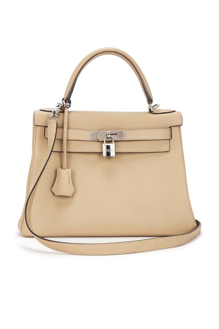 Meet a timeless companion that elevates everyday style. This beige leather satchel channels the iconic Kelly family with a structured silhouette, a graceful top handle, and a detachable shoulder strap for two looks in one. The front is finished with a polished turn-lock clasp and a delicate clochette—all in cool silver hardware that catches the light. Inside, a single main compartment keeps things organized with an interior zipper pocket and slip pockets. Crafted in France from smooth Epsom calfskin with a soft leather lining, it’s versatile enough for the office, travel, or a refined evening out.