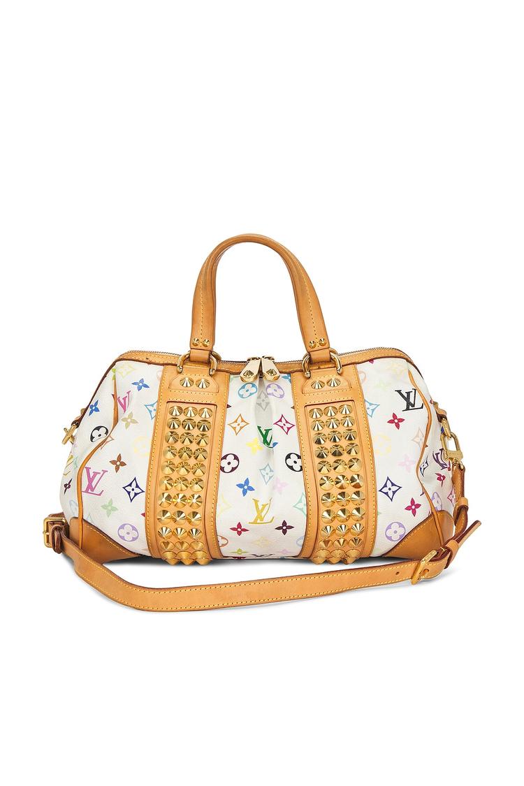 Meet the Louis Vuitton Monogram Courtney MM, reimagined in a vibrant multicolor monogram on white coated canvas with warm tan leather trim. This satchel‑style bag features a top zip closure, a structured silhouette, and a detachable, adjustable shoulder strap for versatility. Inside, a single roomy compartment is complemented by dual interior slip pockets, while gold‑tone hardware adds a touch of luxury. The exterior’s iconic LV logo pattern pairs with studded grommet details and precise topstitching for urban chic that transitions—from day to night—seamlessly. A timeless statement of modern elegance and everyday utility.