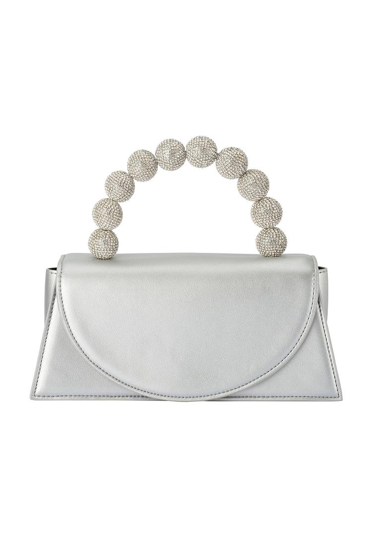 Meet the Gianna Top Handle Bag by Olga Berg — a sleek, silver-toned statement for evenings and special occasions. Crafted in faux leather with a soft metallic sheen, it features a curved flap closure with a magnetic snap, a crystal-embellished top handle that catches the light, and a detachable silver-tone chain shoulder strap for hands-free elegance. Inside, a single roomy main compartment with pockets keeps your phone and cards organized and within reach. The compact silhouette fits the essentials—perfect for after-dark dinners, weddings, or a night out, elevating any monochrome or metallic outfit.