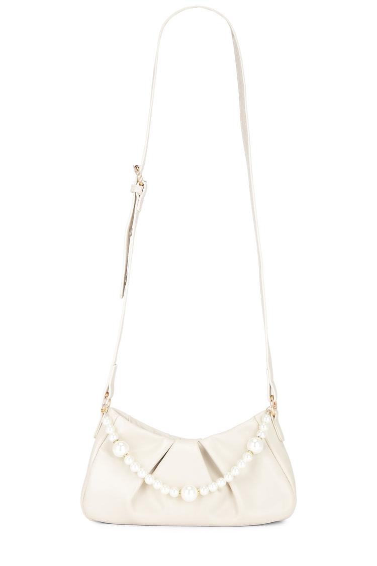 Meet Kamille Bag, a compact cream faux-leather statement with a canvas-lined interior. This versatile piece features a secure top zipper and one main compartment, plus two detachable handles—pearl embellishments for a touch of elegance and a detachable smocked faux leather top handle for versatility. An adjustable faux leather shoulder strap allows comfortable crossbody wear, while the pale hardware gleams softly against the soft, refined exterior. Perfect for day-to-night use, its refined pleated silhouette and pearl accents elevate any outfit—from casual denim to a tailored evening look.