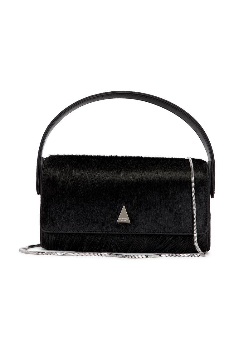 Meet the Calfhair Pochette Bag by VERAFIED — a sleek, evening-ready silhouette that elevates any look. The genuine calfhair exterior pairs with a soft leather lining in a deep black, finished with polished silver-tone hardware. A flap top with magnetic snap opens to a single main compartment and an interior card slot, accented by a minimalist front triangular logo plaque. The design includes a detachable silver-tone chain shoulder strap and a curved top handle for versatility. Measuring approximately 19 cm W x 11 cm H x 4 cm D, it’s the perfect compact bag for cocktails, dates, and nights out.