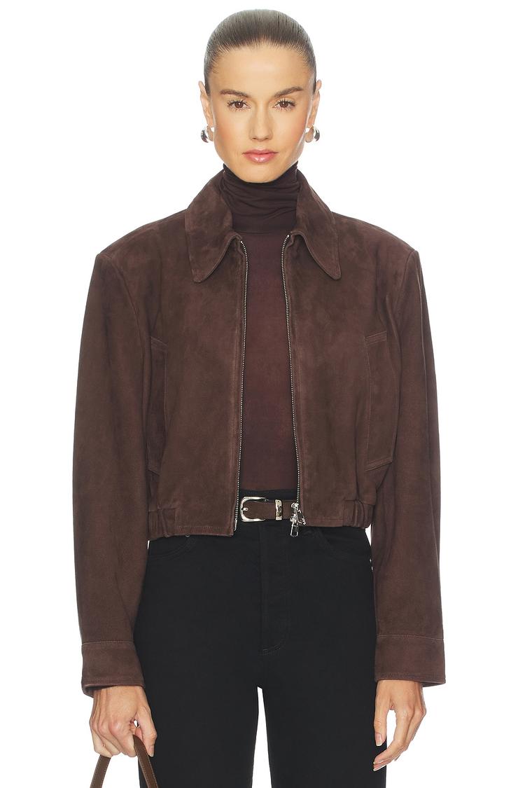 This cropped suede jacket features a matte dark brown dyed goatskin fabric with a classic turn-down collar and long regular sleeves. The jacket closes with an exposed front zipper and includes front slip pockets and an elastic waistband for a comfortable, regular fit. Its minimalist, casual chic style suits autumn and spring seasons, making it perfect for casual, streetwear, and workwear occasions. Crafted with polyester lining, this jacket offers a matte finish and clean, timeless appeal.
