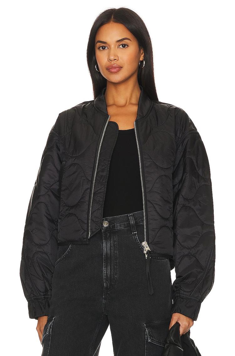 This black quilted puffer jacket features a regular fit with a waist-length silhouette and long sleeves, designed for autumn and winter wear. Crafted from polyester with recycled polyester filling, it showcases a stand collar and dual front zipper closure for easy wear. The jacket is detailed with all-over quilting and functional side slant zipper pockets. Its covered back and regular sleeve styling add to its modern, casual street style appeal, making it perfect for casual outings, travel, or streetwear looks.