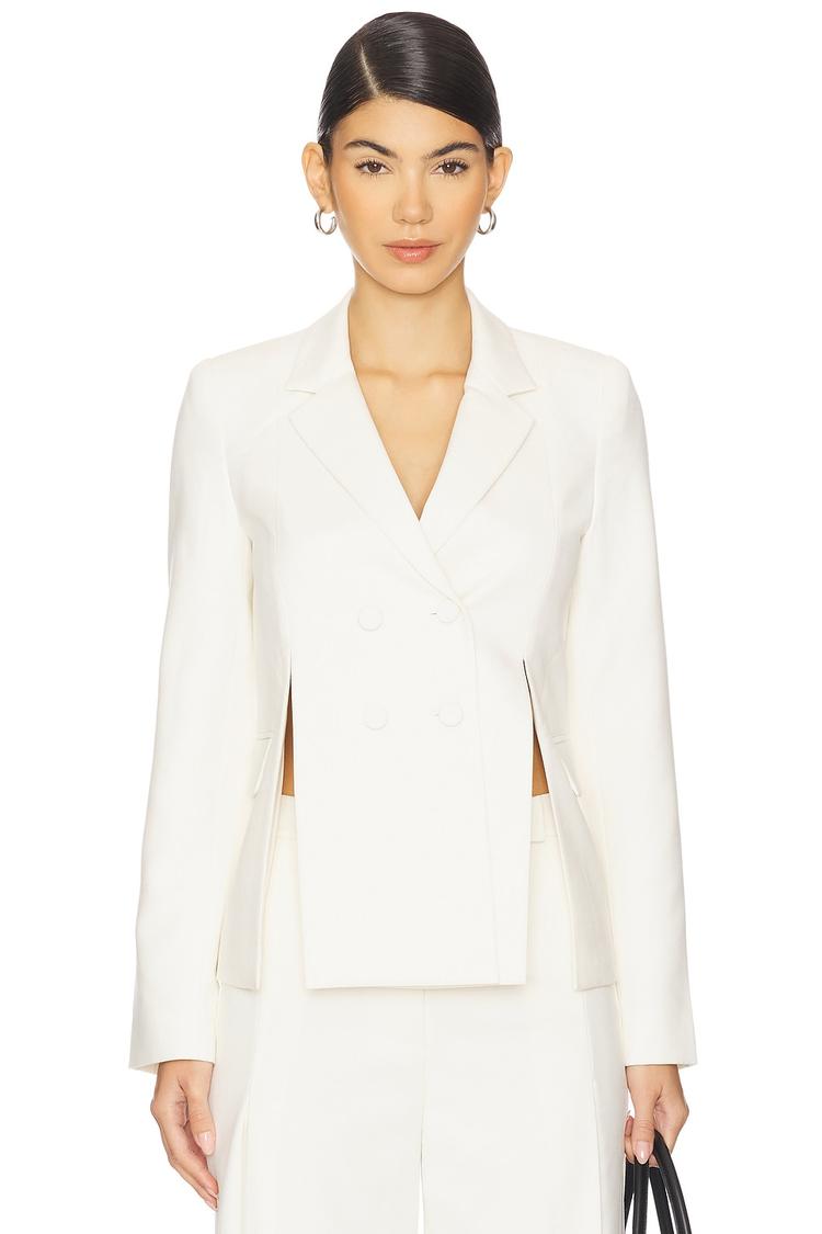 This tailored double-breasted Joaquin Jacket features a classic off-white hue crafted from a smooth polyester-viscose blend with a polyester-elastane lining for comfort. Its hip-length silhouette is complemented by long regular sleeves and a sharp notch lapel collar. The covered back and button closure enhance its sophisticated look, making it ideal for workwear, business casual settings, and conferences. The clean solid design emphasizes timeless chic style suited for autumn, winter, and spring seasons.