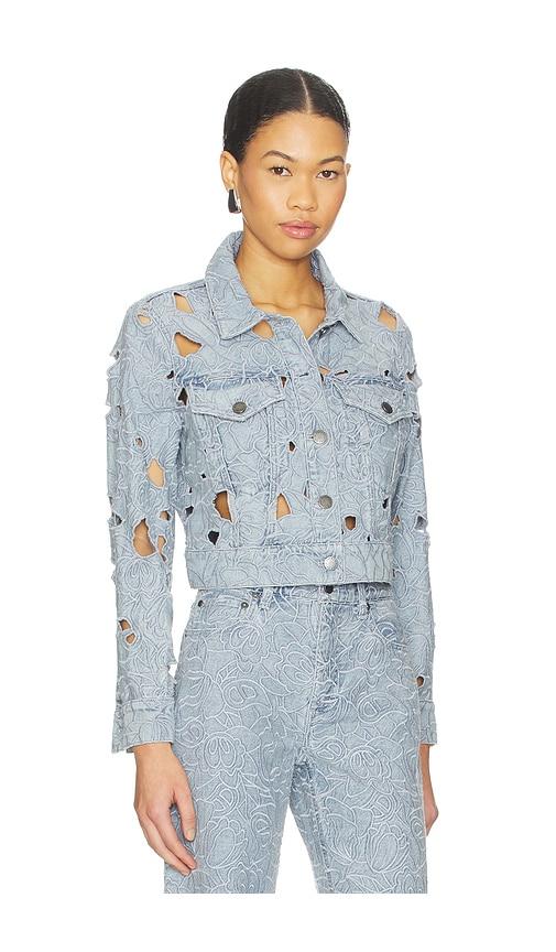 ALICE + OLIVIA CHLOE DENIM JACKET IN BLUE.