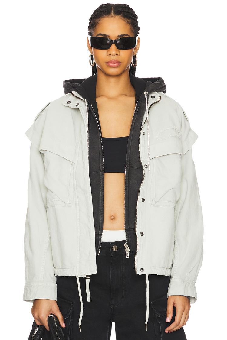This oversized utility jacket in off-white cotton twill offers a relaxed, casual chic silhouette perfect for spring and autumn. It features a stand collar, long regular sleeves with buttoned cuffs, and a waist-length hem with a drawstring for adjustable fit. Functional elements include a hidden front zipper and snap button closure, breast pouch pockets, epaulettes on the shoulders, and a covered back yoke. The jacket's design balances street style with travel-ready practicality, making it ideal for casual outings, travel, or everyday streetwear.
