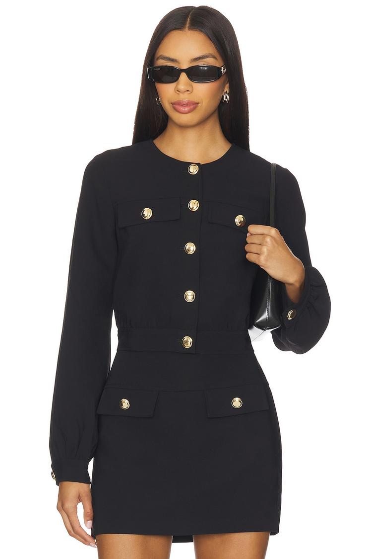 black fitted jacket with gold buttons