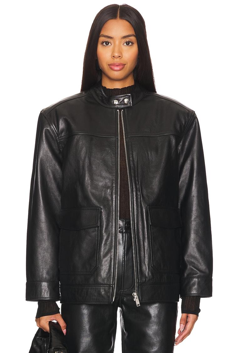 This Henry Jacket by Anine Bing is a matte black leather biker-moto jacket in a regular fit, featuring a hip-length cut and long regular sleeves. It has a stand collar with snap button closure and front zipper fastening. The jacket includes functional zipper pockets, snap buttoned cuffs, and detachable shoulder pads adding an edgy yet classic style. Fully lined with polyester, it is perfect for autumn, winter, and spring wear. Ideal for casual, streetwear, and workwear occasions, this minimalist leather jacket combines timeless design with versatile utility.