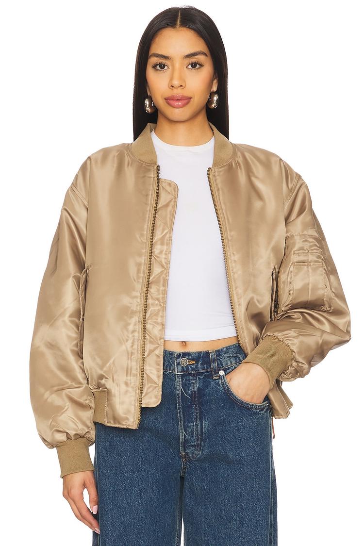 This classic beige bomber jacket features a waist-length silhouette with a regular fit and drop-shoulder long sleeves. Crafted from smooth ripstop polyester with a polyester-viscose blend lining, it offers a matte finish and a band collar neckline. The front zipper closure complements the slant flap button pockets and a utility zipper pocket on the sleeve, adding practical storage. Ideal for casual outings, streetwear looks, and travel, this versatile jacket combines timeless style with functional details, perfect for autumn, spring, and mild winter layering.