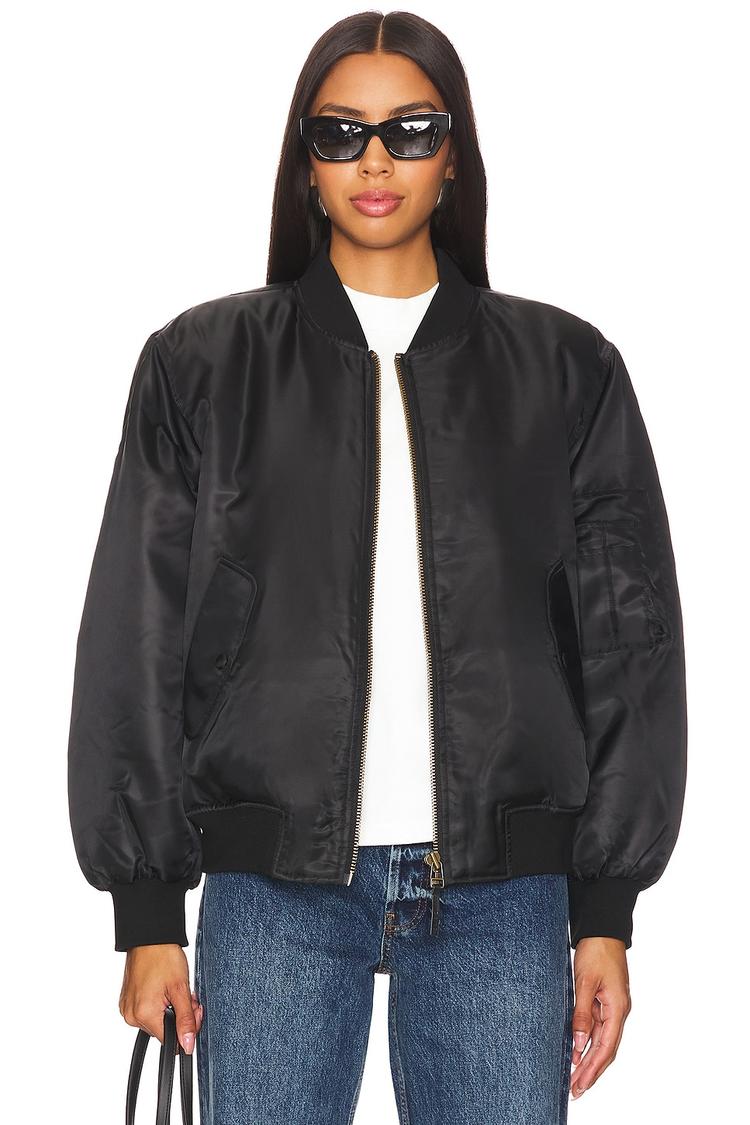 This Leon Bomber jacket features a relaxed fit and waist-length silhouette crafted from smooth polyester gabardine fabric with a polyester-viscose lining for comfort. Designed with a classic crew neck and long drop-shoulder sleeves, it includes an exposed front zipper closure and practical slant flap pockets on the front and a cargo pocket on the sleeve. The matte black finish offers a minimalist, street style vibe ideal for casual outings, travel, and everyday streetwear during transitional seasons like spring, autumn, and winter.