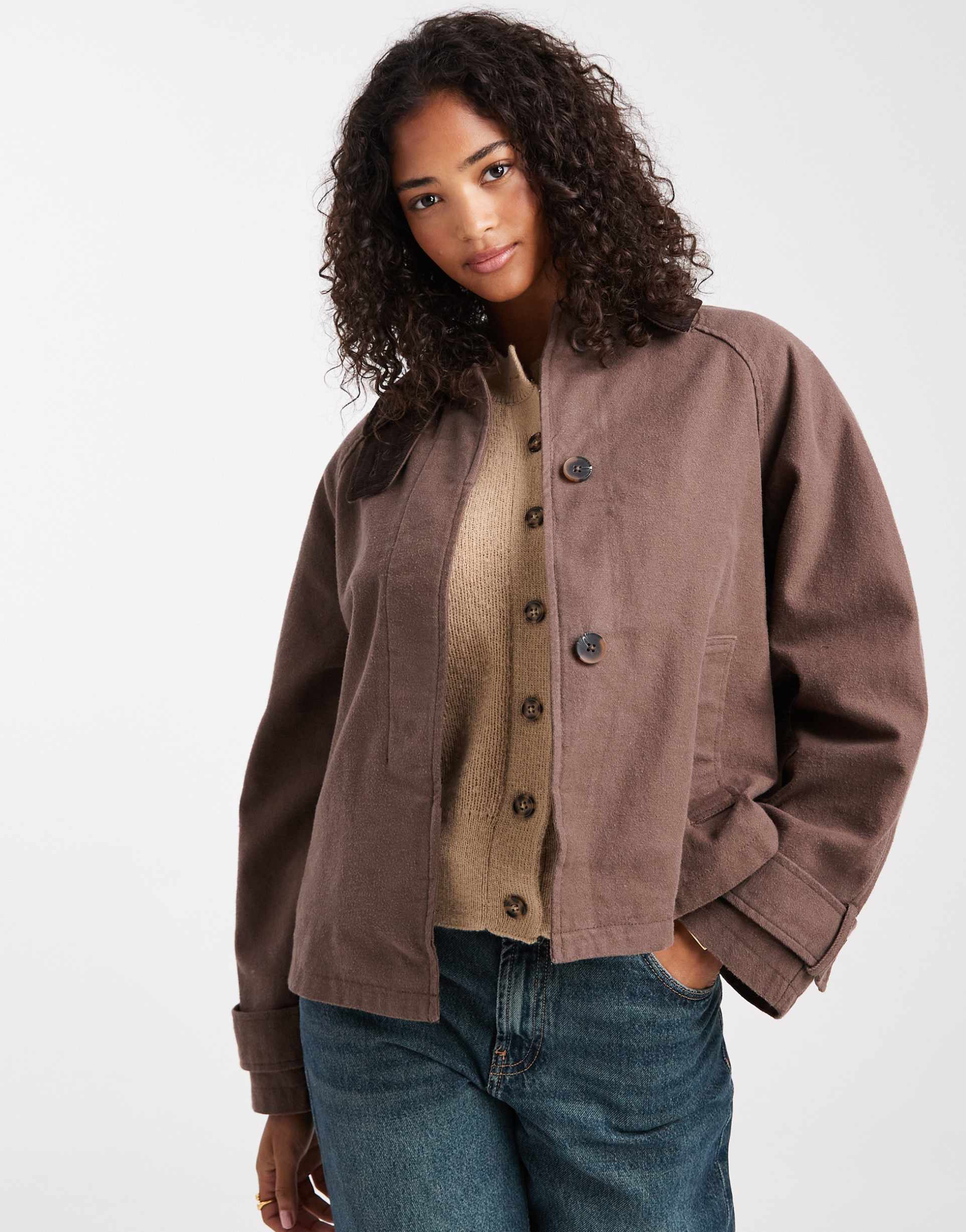 This ASOS DESIGN barn jacket features a soft matte mocha cotton fabric with a contrasting turn-down collar for added style. The boxy silhouette and regular fit ensure comfortable wear, while the long drop-shoulder sleeves and waist-length cut keep it casual and versatile. It closes with a button placket and includes practical side pockets. The jacket is lightly lined with polyester, making it suitable for spring and autumn casual outings, streetwear looks, and travel wear.