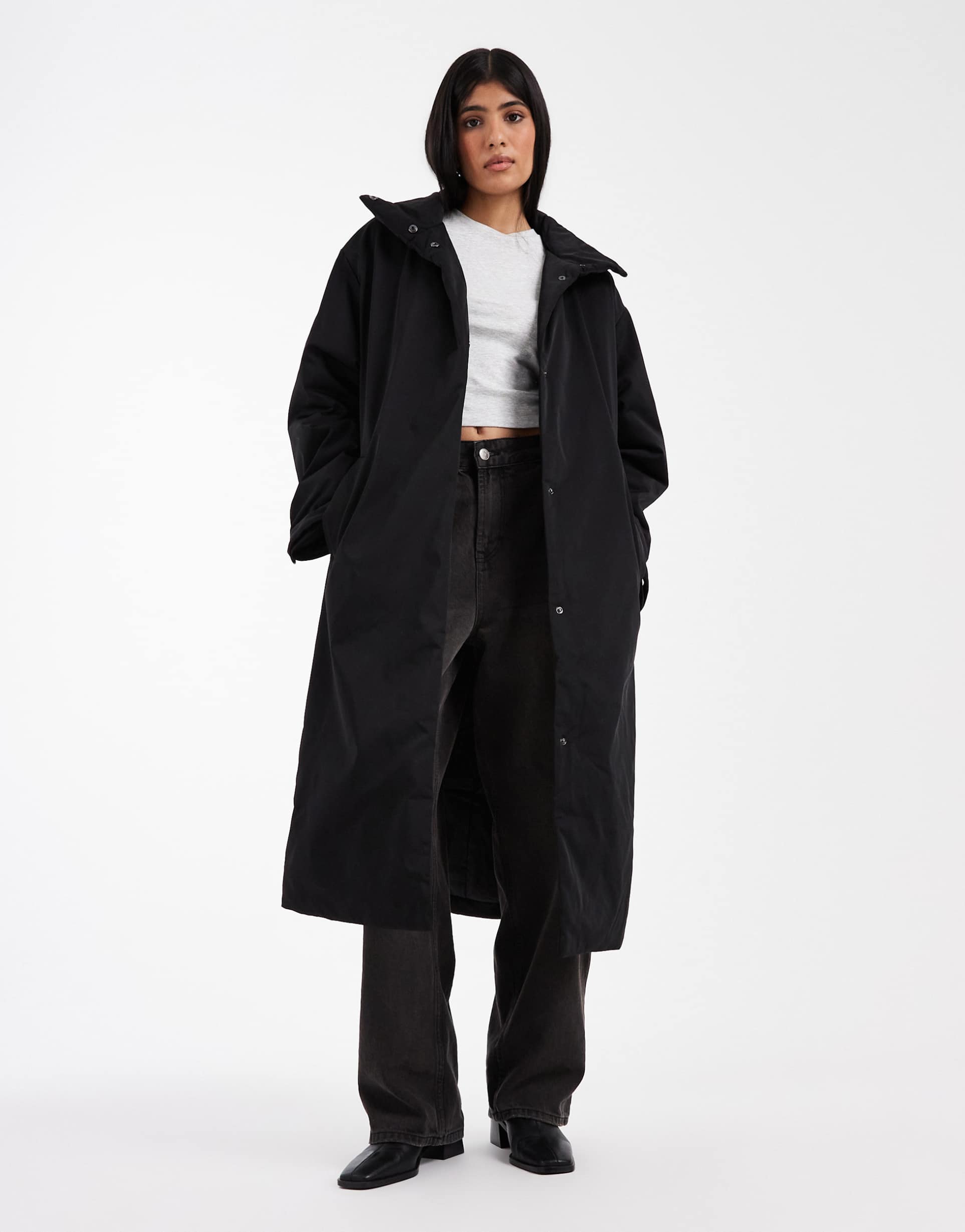 This ASOS DESIGN longline padded jacket features a sleek black polyester fabric with a smooth woven texture. The oversized fit and full length silhouette create a relaxed and cozy look, complemented by a high collar and long regular sleeves. The snap button placket and side pockets add functional details, perfect for casual, streetwear, and travel occasions during autumn and winter. Lined and padded with polyester for warmth, this minimalist jacket combines comfort with practical style for everyday wear.