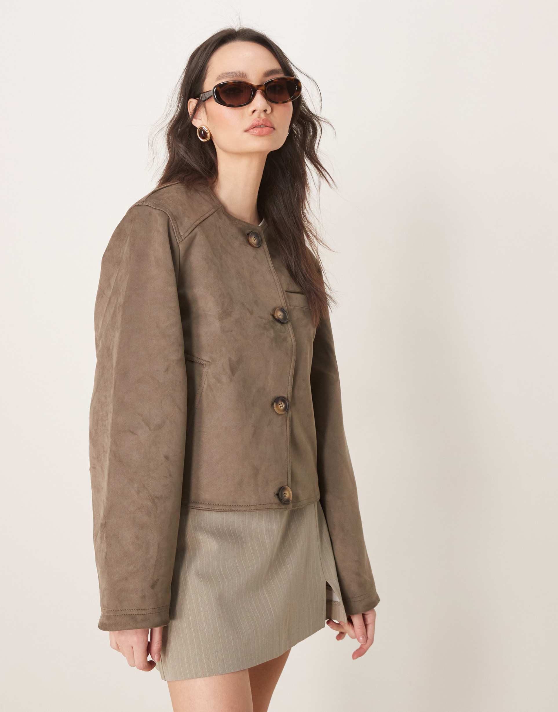 ASOS DESIGN COLLARLESS FAUX SUEDE JACKET IN MUSHROOM