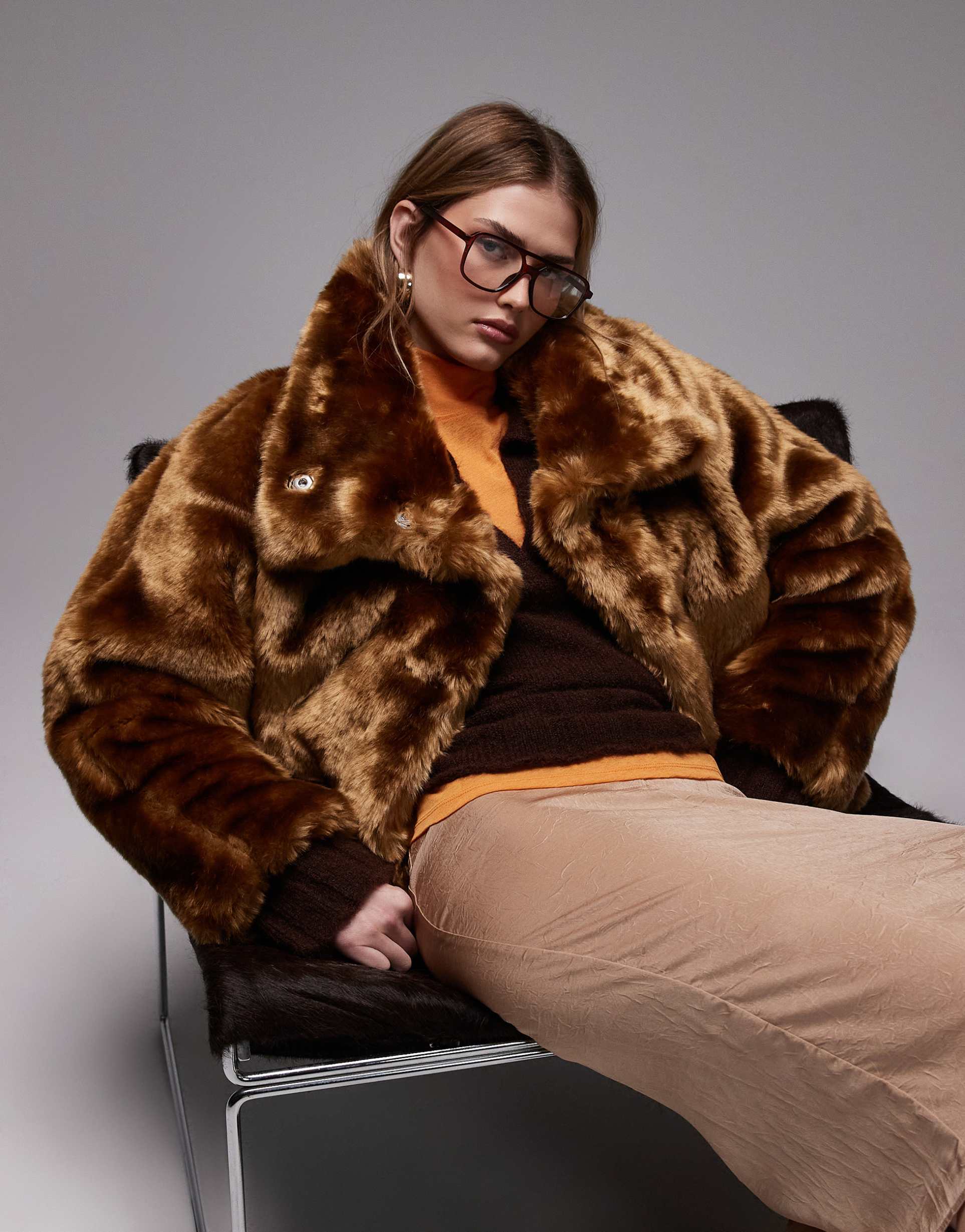 ASOS DESIGN FUNNEL NECK OVERSIZED FAUX FUR JACKET IN BROWN