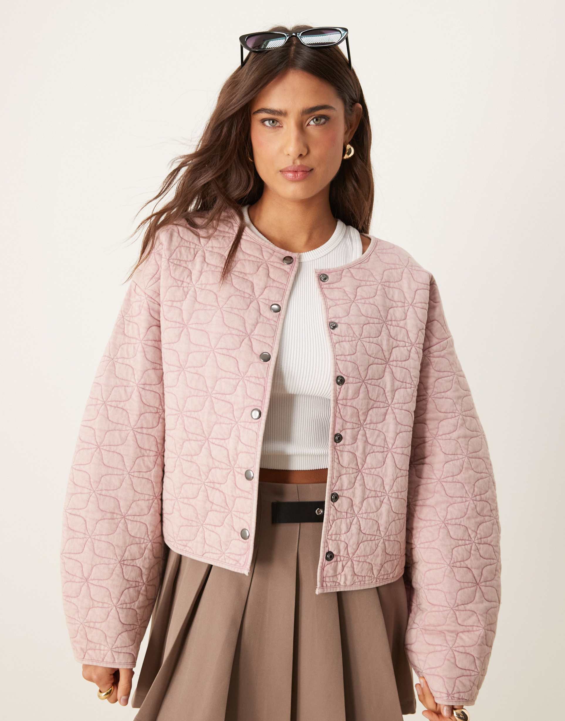 This ASOS DESIGN oversized blouson jacket in washed dusty pink features a quilted finish with all-over stitching that adds texture and interest. The waist-length silhouette offers a regular fit with cocoon-style drop-shoulder sleeves for a relaxed yet structured shape. It has a collarless round neckline and a snap button placket for easy closure. Crafted primarily from cotton with soft stretchy jersey details, this jacket is perfect for casual, streetwear, and travel occasions during spring and autumn.