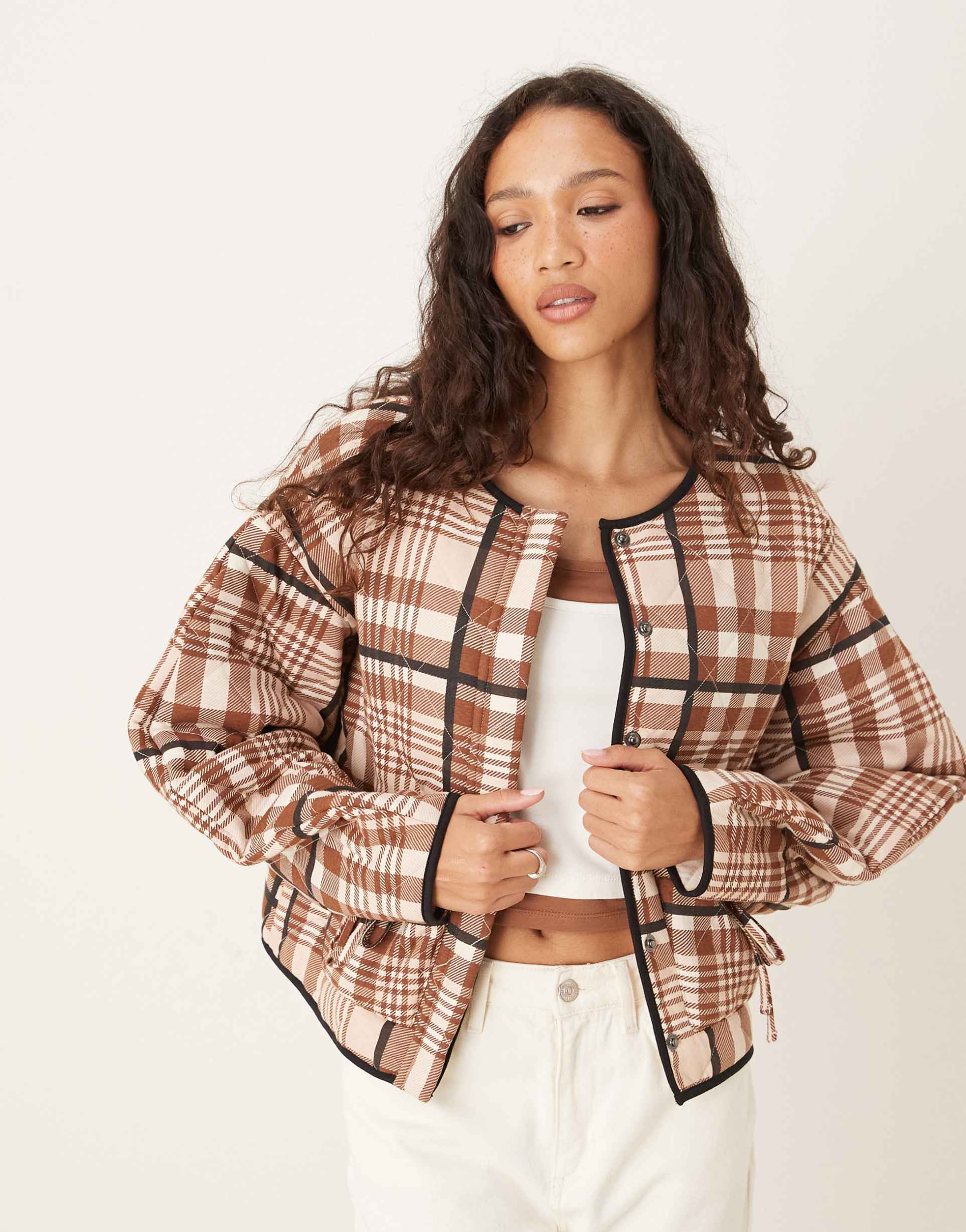 This ASOS DESIGN quilted jacket showcases a chic plaid pattern in pink and neutral tones, crafted from 100% cotton plain-woven fabric. Featuring a round neck and long regular sleeves, the jacket offers a regular fit and waist length silhouette. Quilted detailing enhances its texture, while bow accents on the pockets add a feminine touch. Functional pockets provide practicality, making it ideal for casual, streetwear, or travel occasions during autumn, winter, or spring. The open front closure complements its relaxed style, making this jacket a trendy yet comfortable layering piece.