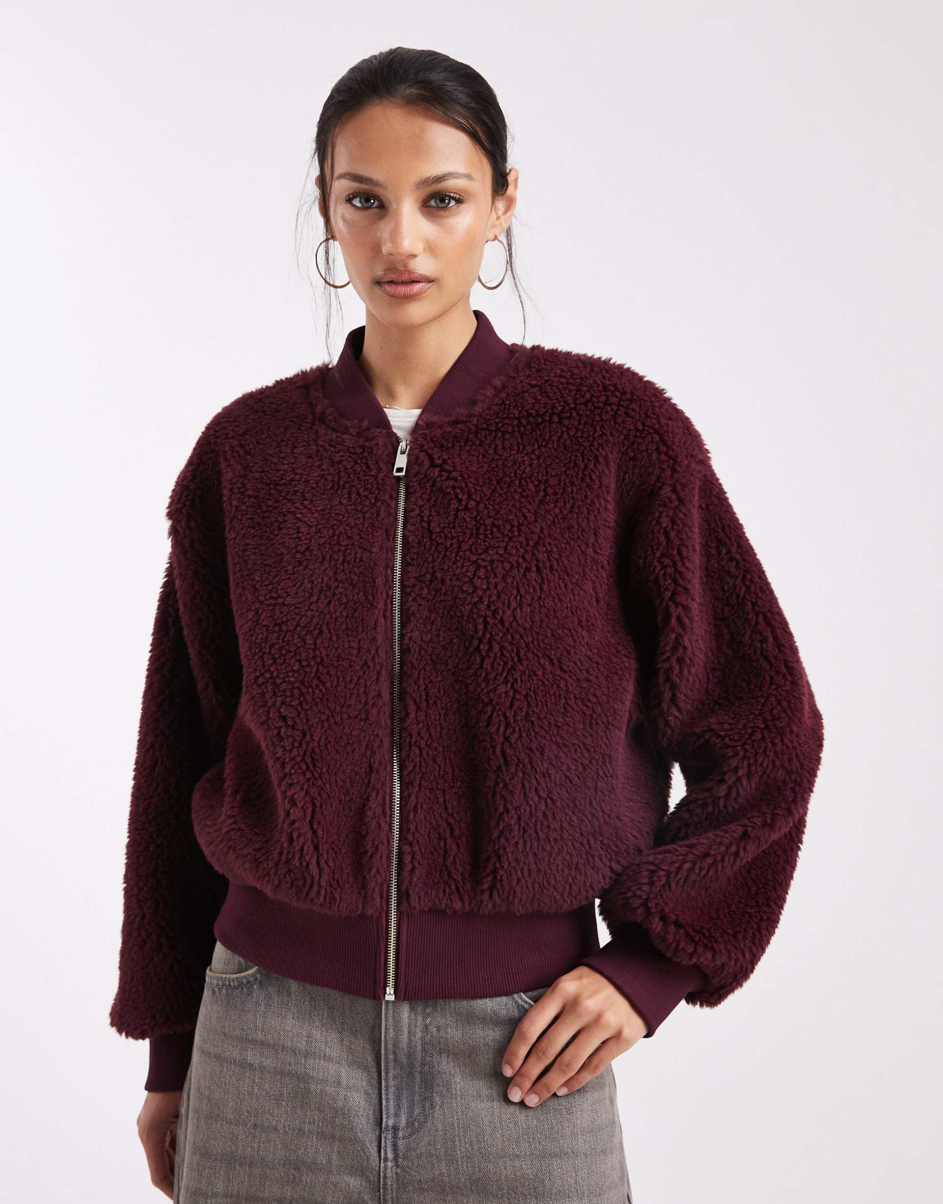 ASOS DESIGN TEDDY BOMBER JACKET IN BURGUNDY