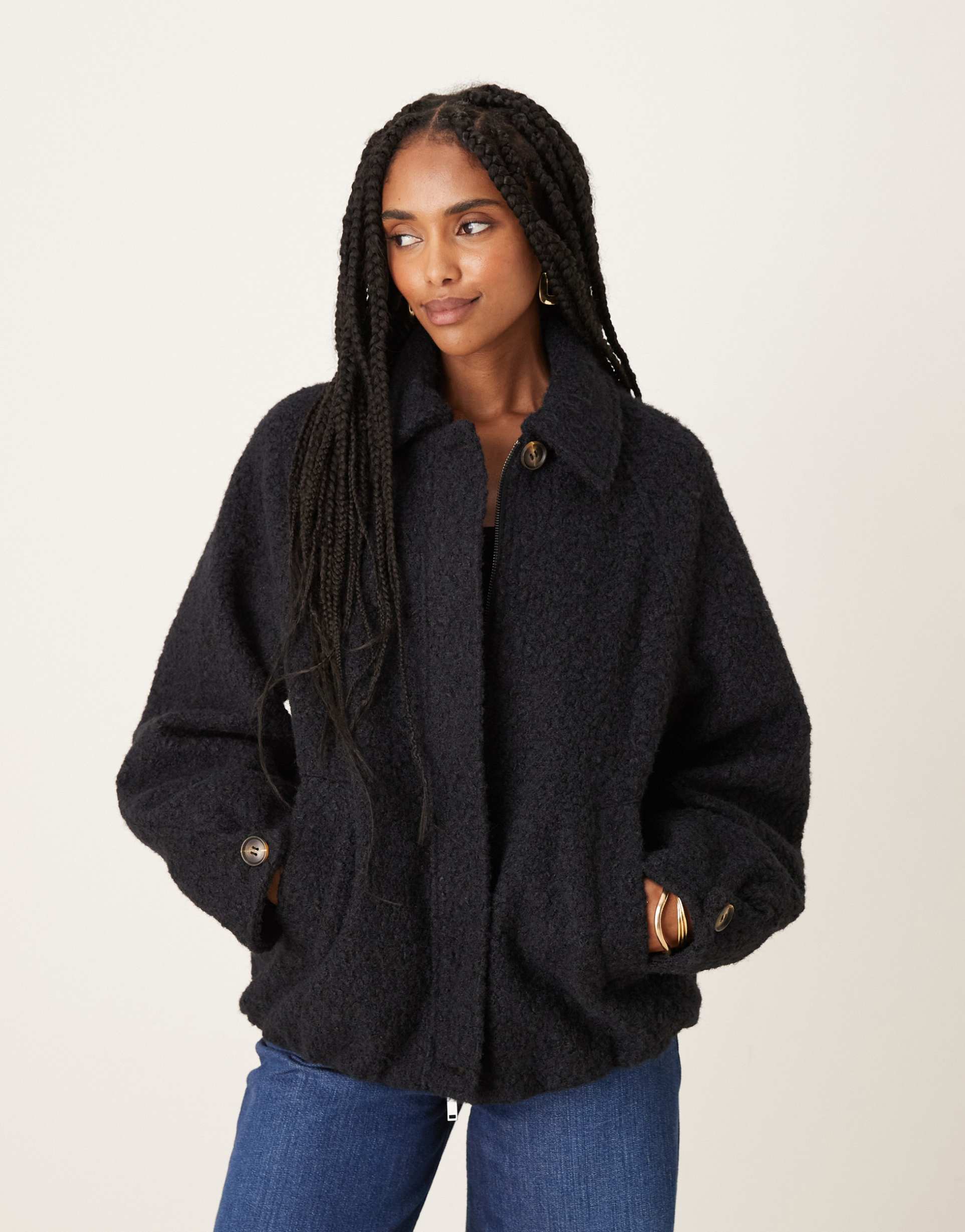 This ASOS DESIGN bomber jacket features a textured brushed fabric in a deep navy hue, offering cozy warmth for autumn and winter. It has a classic spread collar and a combination of button and zip front closures for versatile styling. The jacket is hip-length with long, regular sleeves and a regular fit, making it suitable for casual and streetwear looks. Practical side pockets add functionality, while the polyester shell and lining provide smooth comfort. Perfect for casual outings, street style, and travel, this jacket combines comfort with laid-back chic.