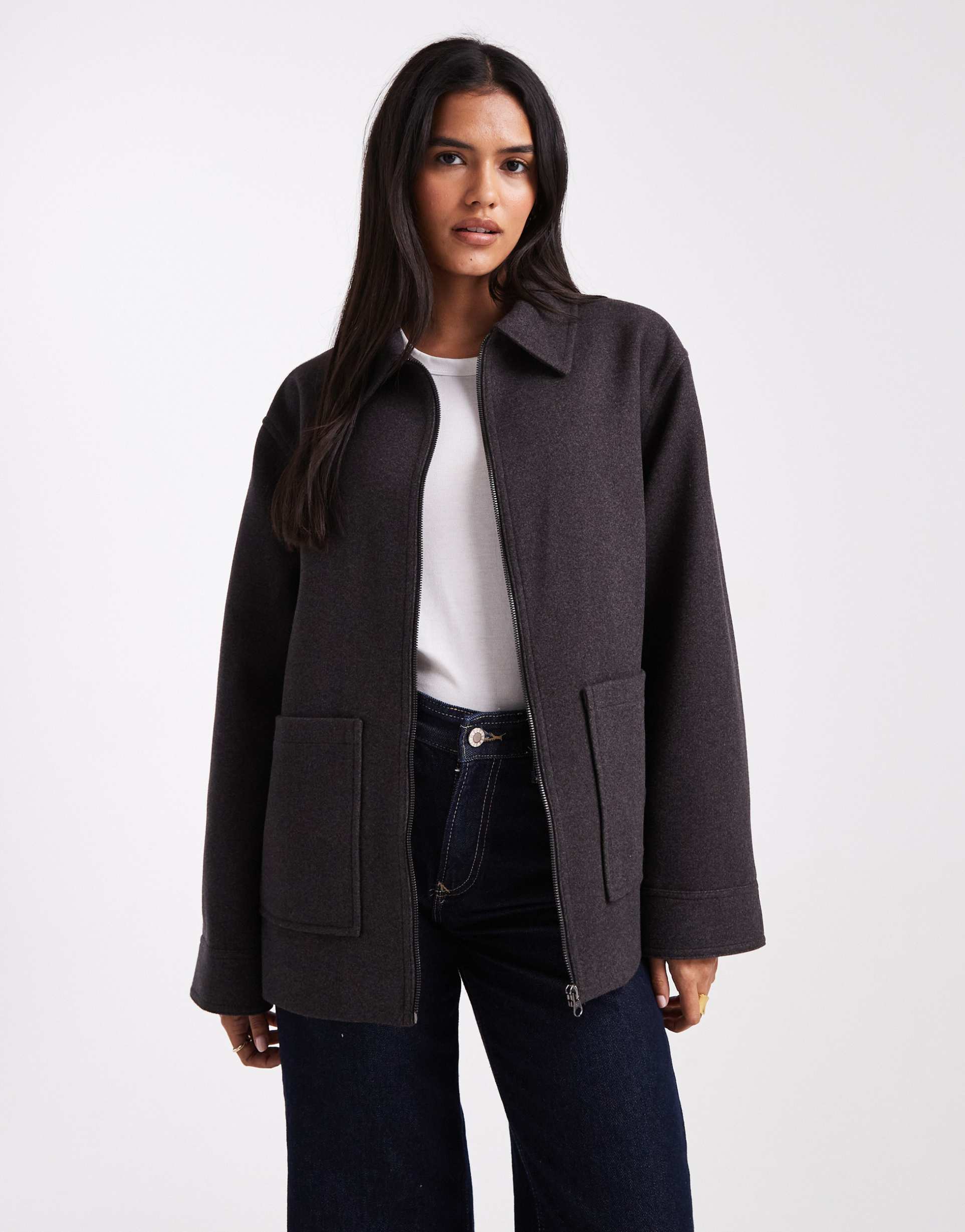 This ASOS DESIGN Harrington jacket in matte charcoal grey features a hip-length, boxy fit ideal for casual and streetwear looks. Crafted from soft polyester with a matte felt texture, it offers a spread turn-down collar and long regular sleeves with buttoned cuffs. The jacket includes two patch pockets on the front and a front zipper closure for easy wear. Fully lined with polyester, it suits transitional seasons like autumn, spring, and mild winter days. Perfect for travel, casual outings, or street style, this minimalist jacket combines practical pockets with a clean, understated design.