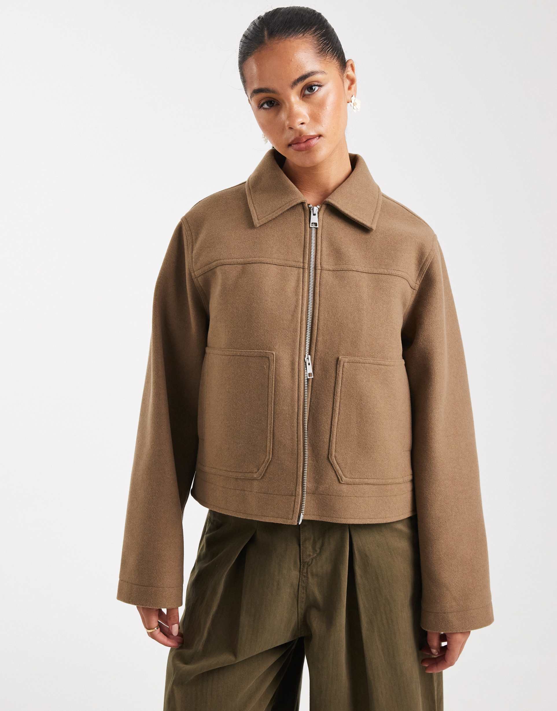This ASOS DESIGN blouson jacket in a matte tan felt polyester fabric features a classic spread collar and a functional two-way front zipper. The regular fit and waist-length cut offer a casual, versatile silhouette, complemented by long regular sleeves. Patch pockets on the front add practical style details. Fully lined with polyester, this jacket is perfect for autumn, winter, and spring casual outings, streetwear looks, or travel layering.
