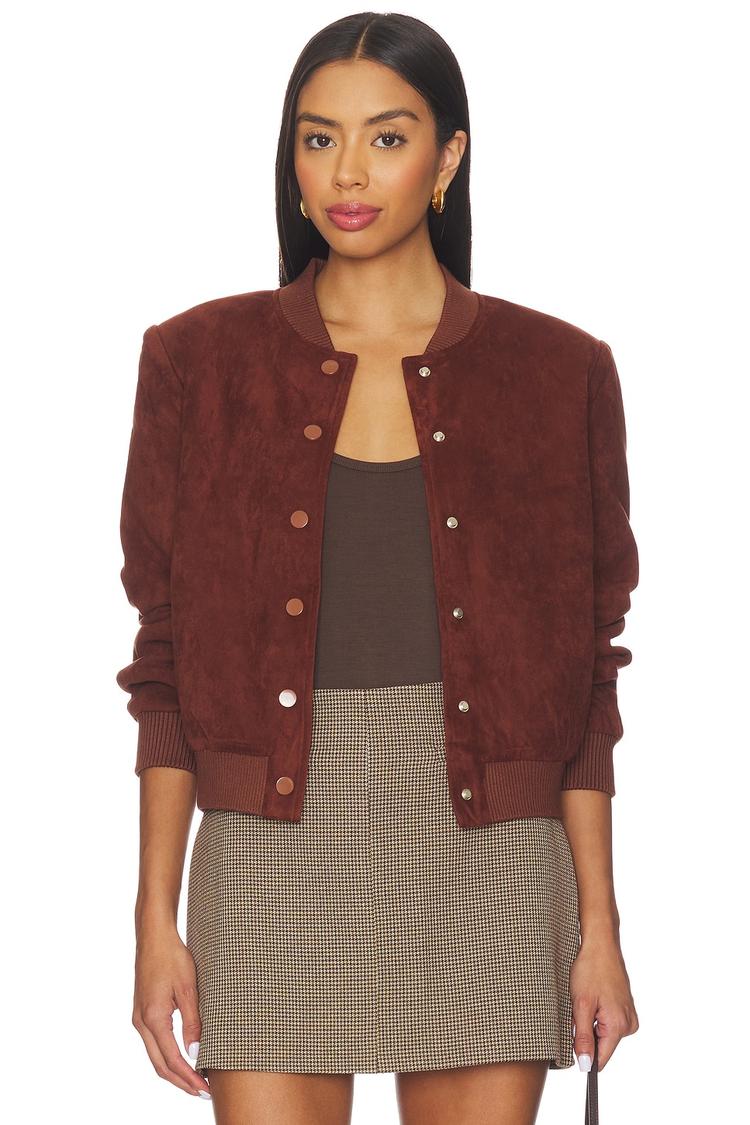 This matte dark brown blouson jacket features a sleek band collar and long regular sleeves, offering a classic waist-length silhouette. Crafted from faux suede with padded fabric treatment and polyester lining, it provides warmth and a subtle texture. The front snap button closure and side slit pockets add functional ease, while ribbed knit trim on cuffs and hem enhance the casual chic vibe. Perfect for street style, casual outings, and travel during autumn, winter, and spring, this regular fit jacket balances style with everyday comfort.