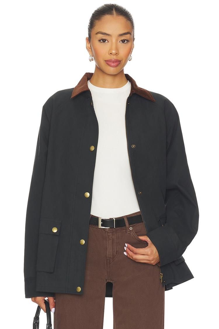 This Utility jacket showcases a matte black midweight cotton twill fabric paired with a contrasting matte brown corduroy turn-down collar. The hip-length silhouette offers a regular fit with long regular sleeves featuring buttoned cuffs. Functional front zipper closure is layered with snap buttons, complemented by large front pockets and epaulettes on the sleeves in brown, adding classic utility style. Perfect for casual outings, travel, and streetwear during autumn and spring, this jacket blends timeless design with practical details and a matte finish for everyday versatile layering.