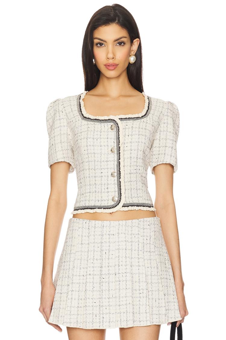 This cropped Zoela jacket features a fitted silhouette in a midweight off-white tweed fabric with a classic checkered pattern all over. It showcases a square neckline with delicate ruffle trim along the borders and short puffed sleeves, adding a feminine touch. The front silver-tone button closure enhances its elegant look, while the polyester lining ensures comfort. Perfect for casual outings, business casual settings, or brunch dates, this chic jacket elevates any ensemble with timeless sophistication.