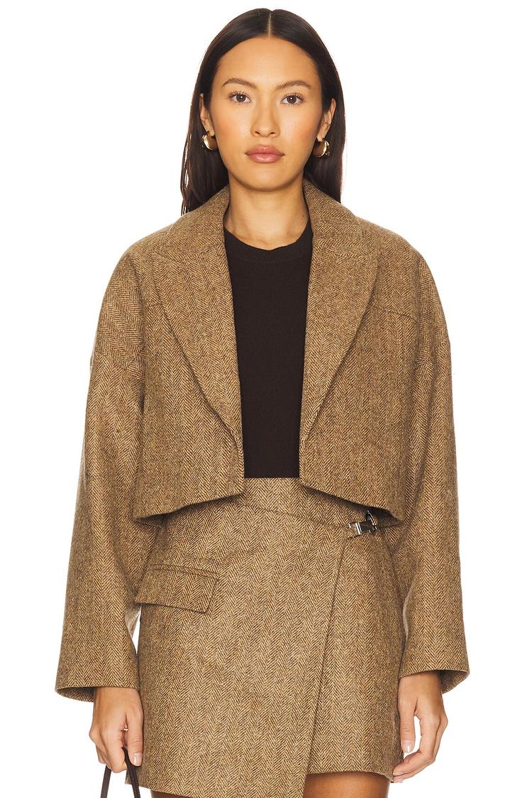 This BA&SH Camala Jacket features a cropped, rigid tweed fabric made from 100% virgin wool with a viscose lining for comfort. It offers a classic, minimalist style with long regular sleeves and structured lapels, creating a modern silhouette. The jacket has a regular fit and a pullover design, accompanied by side seam pockets for functionality. Its matte brown hue and textured wool fabric make it an ideal choice for autumn and winter seasons. Suitable for casual outings, workwear, and business casual occasions, this cropped jacket adds a sophisticated touch to your wardrobe.
